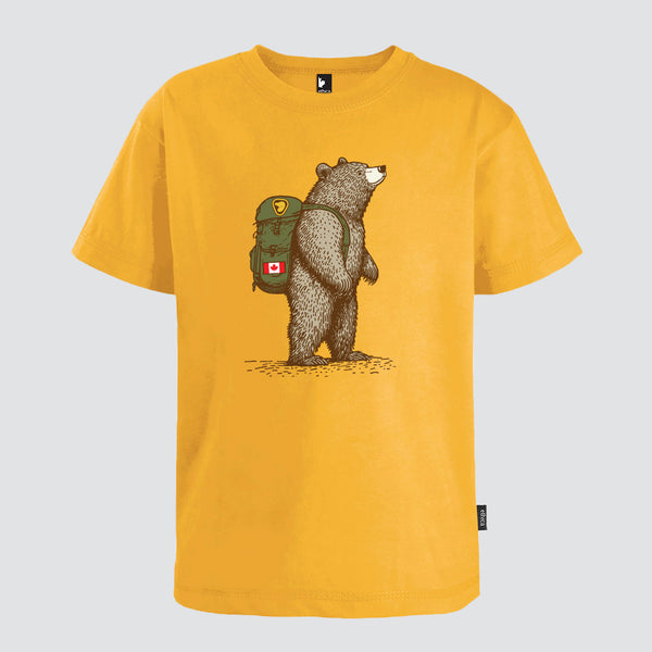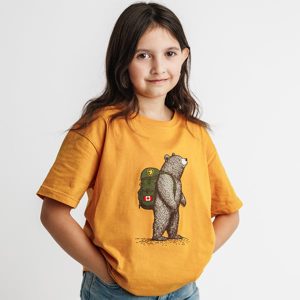 Ce t-shirt amusant pour jeunes est décoré d'un ours de Parcs Canada en randonnée en plein devant, en couleur.